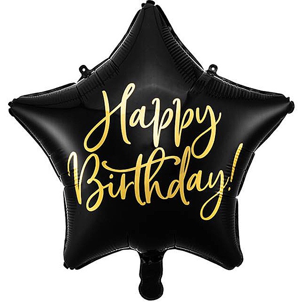 originální narozeninový balónek – fóliová hvězda černá se zlatým nápisem Happy Birthday.