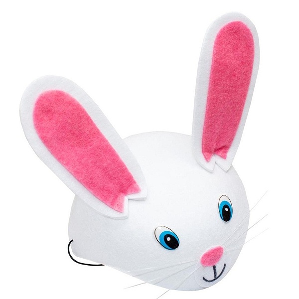 Čepice má dlouhé bílo-růžové uši a navíc růžový nos a modré oči.