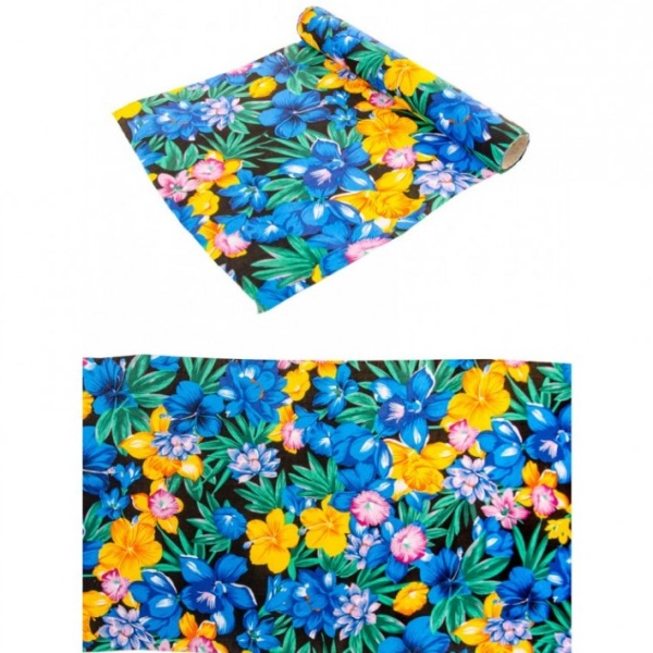 Šerpa je potištěna modrými, žlutými a růžovými květy ibišků, proloženými zelenými palmovými listy.
