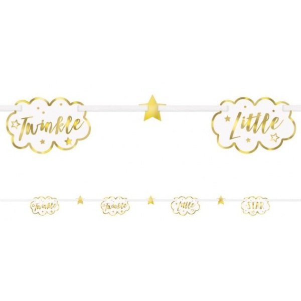 Zlatá girlanda s nápisem Twinkle Little Star, což znamená třpytivá malá hvězda vám nesmí na této párty chybět, bude