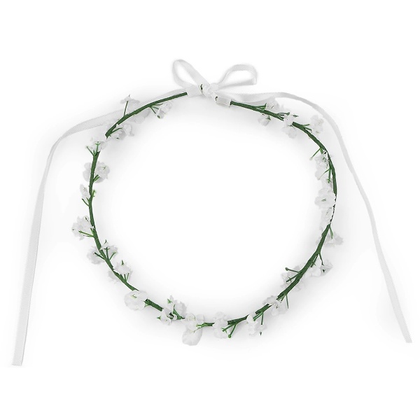 Romantický věneček s drobnými bílými kvítky můžete nosit jako ozdobu vlasů a především by neměl chybět v účesu družičky. Lze použít také k dekoračním účelům. květy jsou připevněné k drátěné kostře, která je obalená papírem. Díky drátěnému základu můžete věneček tvarovat, velice příjemně se nosí.
