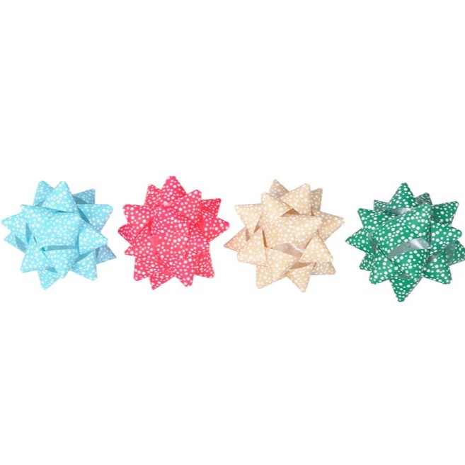 Rozetka s potiskem bílých puntíků v mixu barev. Ideální dekorativní prvek, nejčastěji používaný k ozdobení dárkových balíčků a slavnostních balení. Dodává dárkům či dekoracím estetický a slavnostní vzhled, zejména při příležitostech, jako jsou Vánoce, narozeniny nebo jiné oslavy. Ozdobte své dárky stylově! Je snadno použitelná díky samolepicí zadní straně.