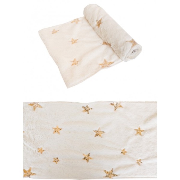 Vytvořte si netradiční sváteční atmosféru vašeho domova pomocí této plyšové stolové šerpy se zlatými hvězdami.