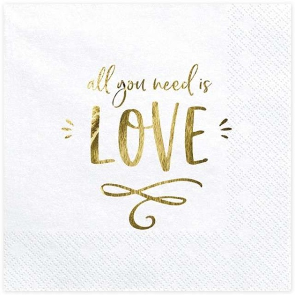 Krásné bílé papírové ubrousky se zlatým metalizovaným nápisem „Vše, co potřebuješ, je láska“.